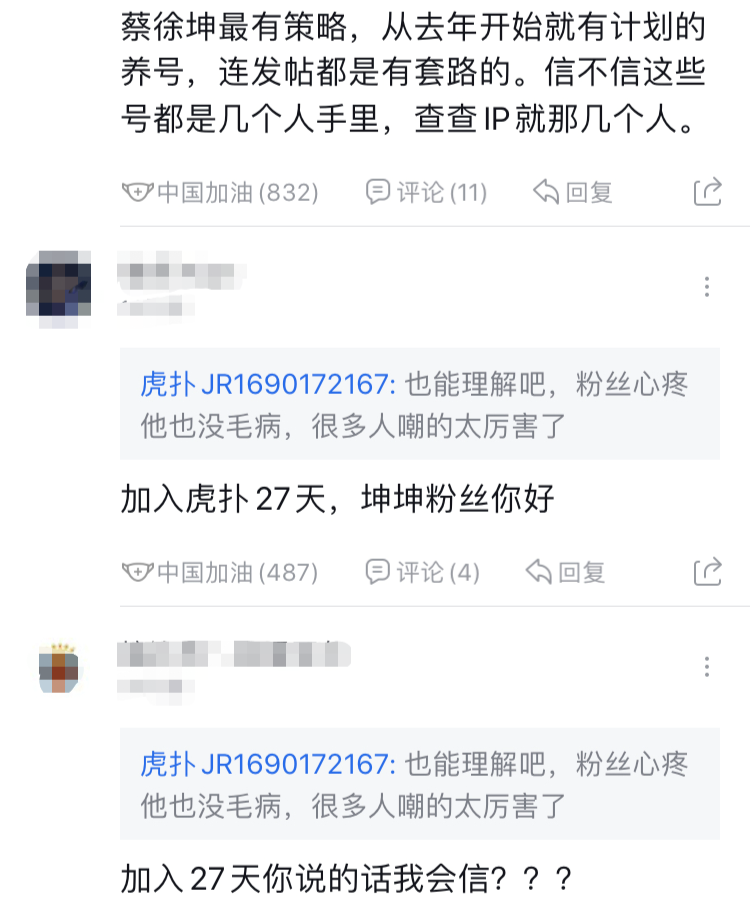 可热评风潮过后,虎扑网友慢慢回过味,在虎扑JRs的传统中,一般有喜欢观看评论者加入虎扑时间长短的习惯。蔡徐坤洗白热评中,虽然也都是直男标准ID,但加入时间一般在一个月到一年半之间。而且相关帖子名称和内容,也出现惊人的相似性和明确的目的性。