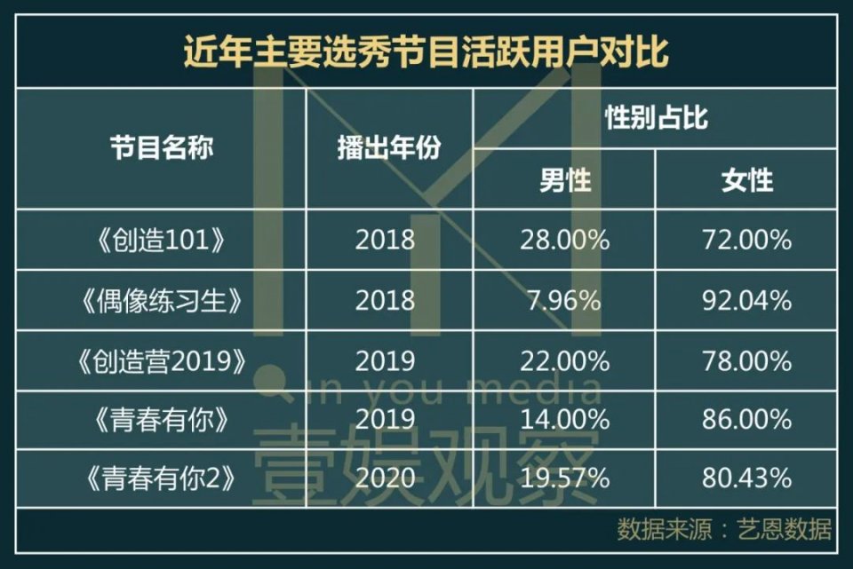 《青春有你2》自播出之后,热度不减,甚至“破圈”市场,成功打入到直男根据地虎扑社区。据艺恩数据统计,《青春有你2》的男性观众占比已经达到19.57%,潜在的饭圈男孩极有可能“蠢蠢欲动”。