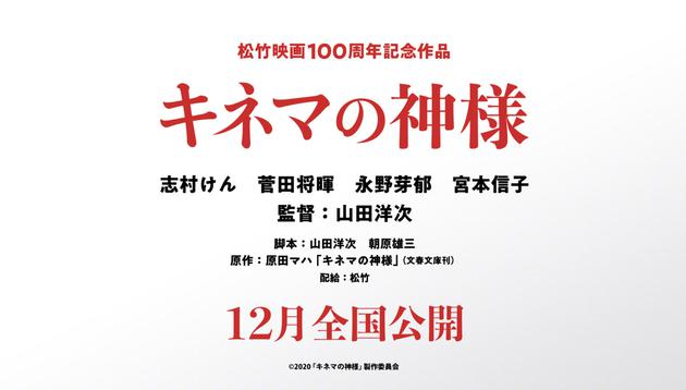 电影《电影之神》(キネマの神様)又译作《向影神祈祷》,改编自原田舞叶的小说,是松竹映画成立100周年的纪念作品。该片由山田洋次导演,志村健、菅田将晖W主演(二人扮演同一角色的不同时期),永野芽郁、宫本信子出演,原定2020年12月上映。