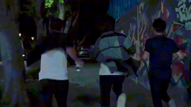 三个大叔开始模仿他们,把头发染得五颜六色,穿上潮服,作天作地。他们先是赶走了涂鸦的几个小伙子,然后开心地接过丢下来的油漆罐,也在墙上画了起来。