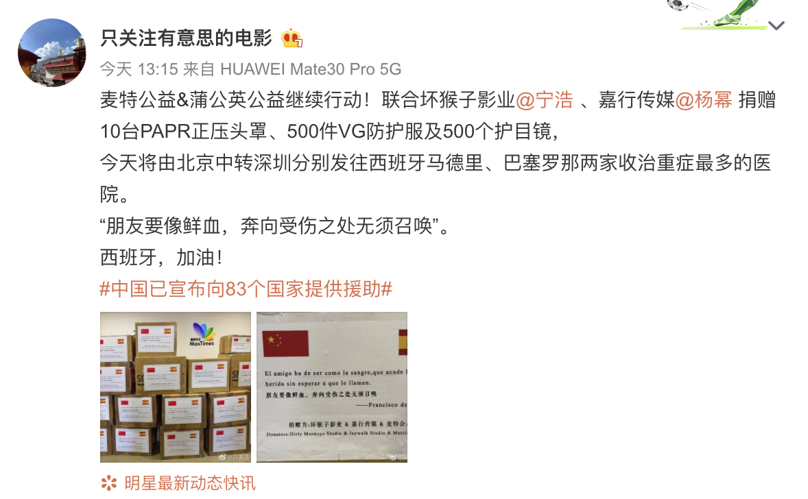 3月26日,某网友发图文表示宁浩、杨幂心系疫情,向海外捐赠物资,这批物资包括10台PAPR正压头罩、500件VG防护服及500个护目镜,26日将由北京中转深圳分别发往西班牙马德里、巴塞罗那两家收治重症最多的医院。
