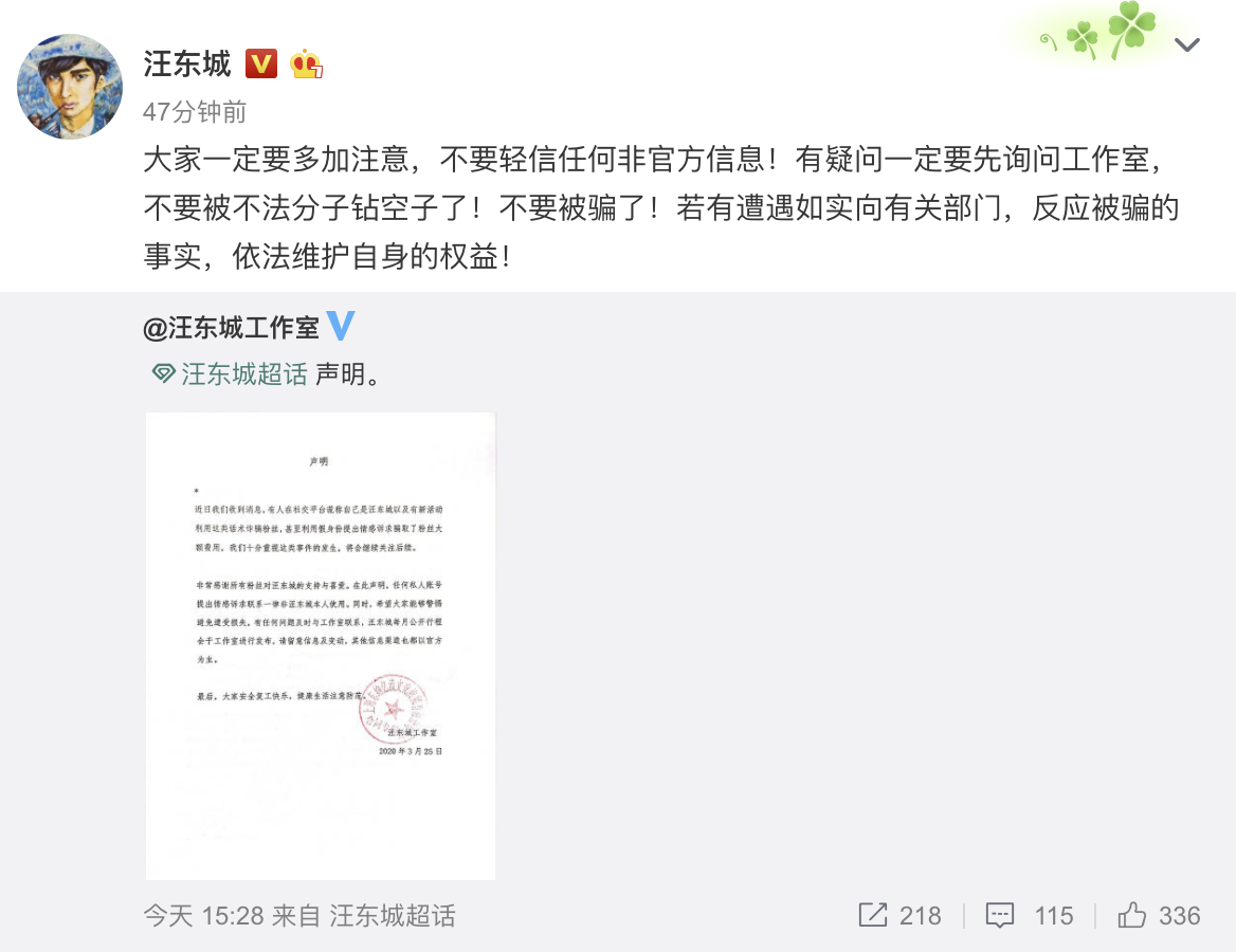 3月26日,汪东城工作室发声明称,近日有人在社交平台谎称自己是汪东城以及有新活动,利用这类话术诈骗粉丝,甚至利用假身份提出情感诉求骗取了粉丝大额费用。因此特别发布声明,表示任何私人账号提出情感诉求联系一律非汪东城本人使用,希望广大粉丝以官方信息为准,希望大家能够提高警惕,避免遭受损失。