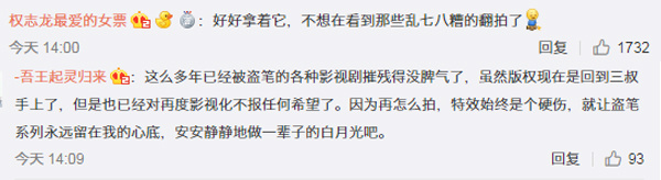 对于《盗墓笔记》版权重回南派三叔手中,不少网友都难掩兴奋。一位网友给南派三叔留言,好好拿着它,不想在看到那些乱七八糟的翻拍了。也有网友表示已经被翻拍伤透了心,这么多年已经被盗笔的各种影视剧摧残得没脾气了,虽然版权现在是回到三叔手上了,但是也已经对再度影视化不报任何希望了。因为再怎么拍,特效始终是个硬伤,就让盗笔系列永远留在我的心底,安安静静地做一辈子的白月光吧。