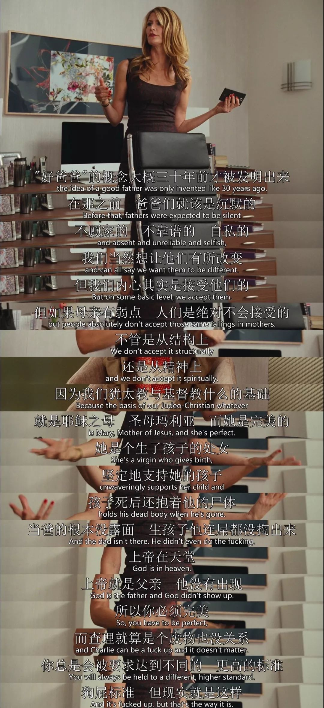 电影《婚姻故事》中有一个华彩式的段落,就是离婚律师的吐槽:母亲必须完美。父亲是个废物都没关系,但人们永远会用不同且更高的标准来要求母亲。