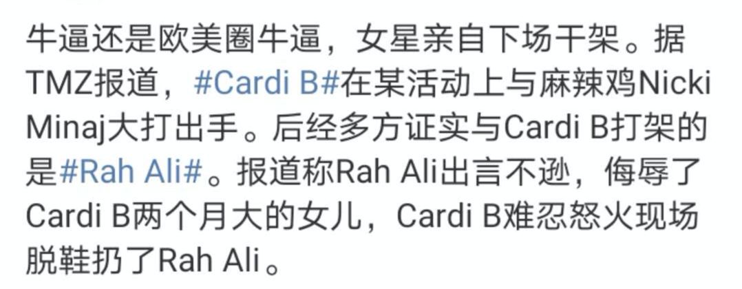 卡迪碧和麻辣鸡这俩hippop女王,一向被传言关系不佳,甚至被爆在某大型活动上大打出手,后被证实是卡迪碧和Rah Ali掐了起来。