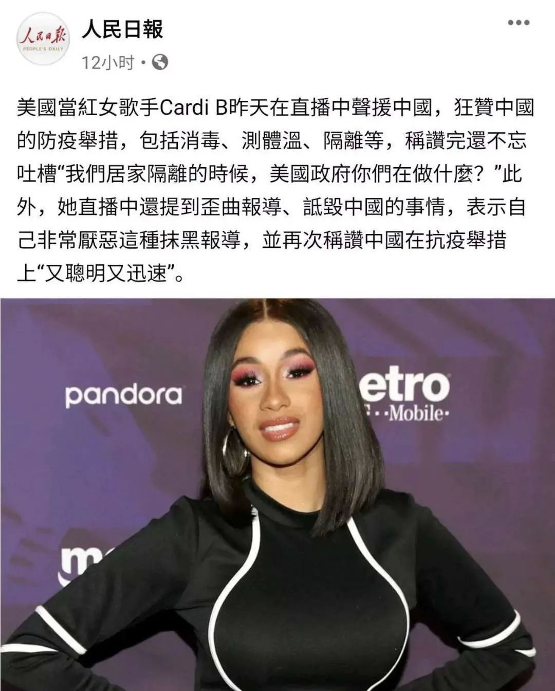 而在国内,不仅深圳卫视跟这位说唱歌手隔空打得火热,就连人民日报都在推特上向卡迪碧抛出了橄榄枝,力赞她声援中国的言论。
