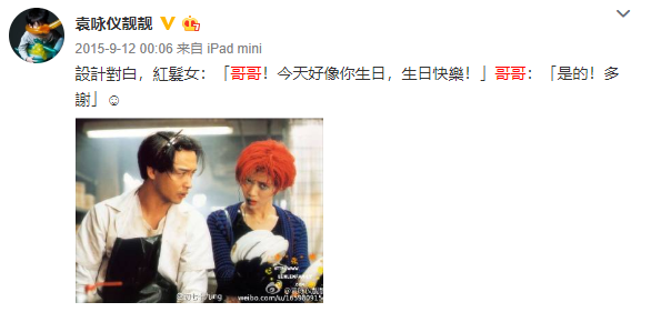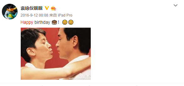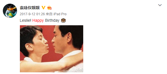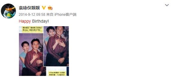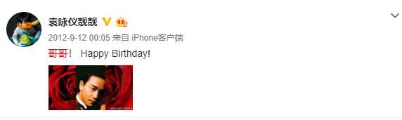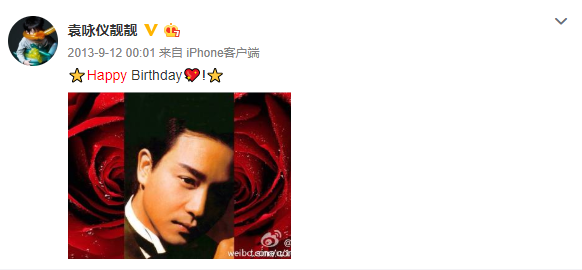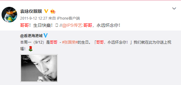 2011年9月12日,袁咏仪在张国荣冥寿这天发文缅怀“哥哥,生日快乐”。