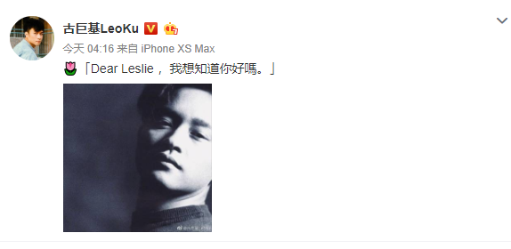 除袁咏仪外,古巨基也在4月1日当天发文缅怀张国荣,配文道:“Dear Leslie ,我想知道你好吗?”