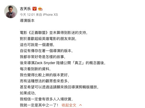 古天乐发文表示希望看到《正义联盟》导演剪辑版