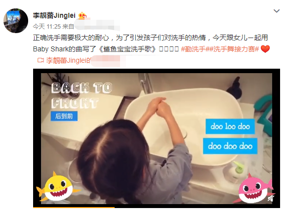 3月26日,王力宏妻子李靓蕾晒出女儿洗手的视频,并发文:“正确洗手需要极大的耐心,为了引发孩子们对洗手的热情,今天跟女儿ㄧ起用Baby Shark的曲写了《鲨鱼宝宝洗手歌》。”