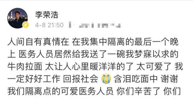就在当晚,可爱又暖心的医护人员们应该是看到了李荣浩的"求助",于是给李荣浩送上了一碗完全符合他想象的拉面,庆祝他隔离结束。里面不仅有牛肉,还有一个煎蛋,感动得他一度"含泪吃面"。