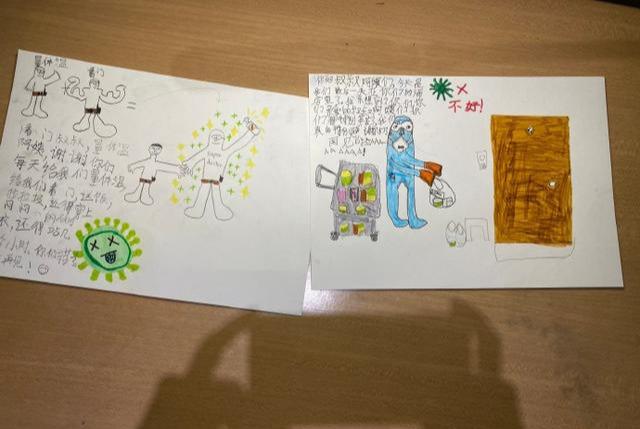 而女儿霓娜则写道:"叔叔阿姨们,今天是我们在酒店的最后一天啦,我就想到了你们,你们都特别辛苦,特别感谢你们,再见啦"。画中也有穿着防护服进房间来收拾垃圾的工作人员,充满了童趣。