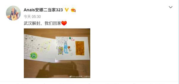 刘烨的妻子安娜一早便激动地发文称,"武汉解封,我们回家",并配上一张孩子们画给工作人员的感谢信,欣喜之情溢于言表。
