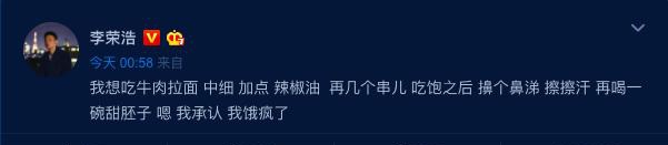 原来,就在8日的凌晨,李荣浩曾在社交平台上表示自己"饿疯了,想吃牛肉拉面",并对这碗拉面有极其详尽的想象,让人看了也会忍不住想吃一碗。此时已经是李荣浩集中隔离的最后一天了。