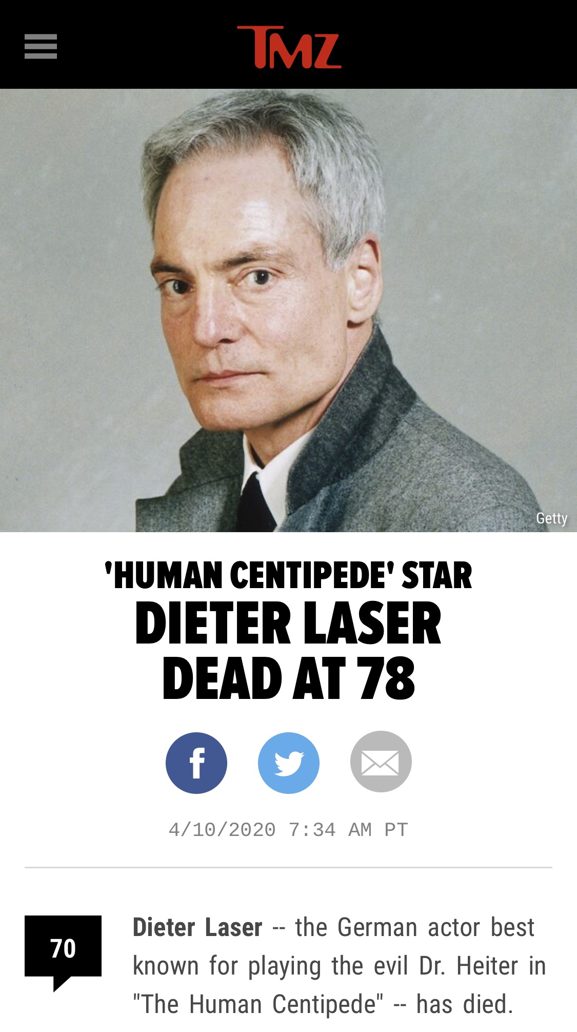 4月11日,据外媒报道,凭借着电影《人体蜈蚣》获得德国影帝殊荣的男演员戴特·莱瑟去世,享年78岁,助理在戴特·莱瑟离世一个多月后才公开他的死讯,戴特·莱瑟于当地时间2月29日去世,死因暂时未知。