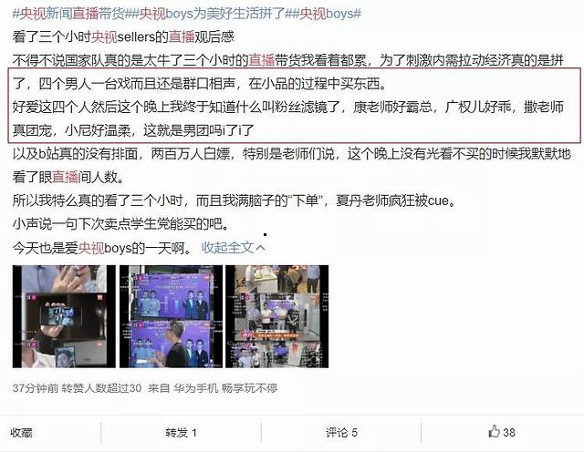 一些观众还认为直播达到了直播历史的顶峰。它充满了地域性和内涵。四个人似乎很吵。每个人都有明确的分工,扮演不同的角色。他们只是让现场直播比综艺节目更精彩。康辉盛气凌人,奈杰尔·麦赫麦特温文尔雅,朱广权经常说出令人吃惊的话,撒贝宁被称赞为一个最受欢迎的群体,而皮肤是最活泼的气氛。