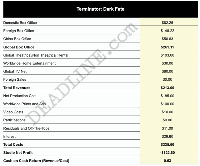 然而,《终结者:黑暗的命运》在电影评分中仍获得B+分,腐烂番茄的新鲜度为70%。《终结者:黑暗命运》也成为派拉蒙和天舞继去年10月的《双子座男人》之后的第二剂票房毒药。当然,这部电影的其他所有者,如20世纪影业和腾讯,也尝到了苦果。
