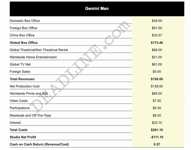 当粉丝们在社交网站上看到更多“双子座男人”的照片时,他们的兴趣急剧下降。《双子座男人》在腐烂的西红柿中的新鲜度只有21%,该电影在北美第一个周末的票房为2060万美元。这个结果对于电影的拍摄成本来说是非常低的。