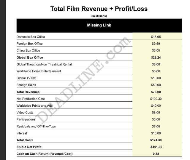 这也是莱卡动画公司第一次放弃其老合作伙伴分众影业,并选择由安娜普尔纳和米高梅建立的联合艺术公司在北美发行《迷失链接》,该公司在北美的票房仅为1665万美元。自动增益控制工作室负责《迷失链接》的海外发行。然而,《迷失的链接》不是《冰河世纪》,它的海外票房只有960万美元。