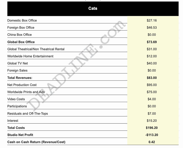 泰勒和米德多的集合;斯威夫特,詹妮弗&米德多;詹姆斯·哈德逊&米德多;戈登、伊德里斯和米德多;厄尔巴岛,杰森&米德多;朱蒂&米德多·德鲁罗;齐丹和其他人的电影已经从最初设想的史诗电影变得一团糟。《猫》中腐烂番茄的新鲜度仅为21%,北美为2717万美元,海外为4653万美元,全球为7370万美元。