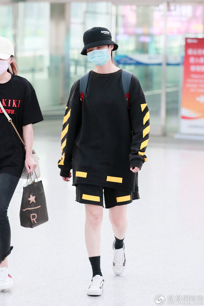 李宇春穿着条纹卫衣和短裤再次出现在机场。
