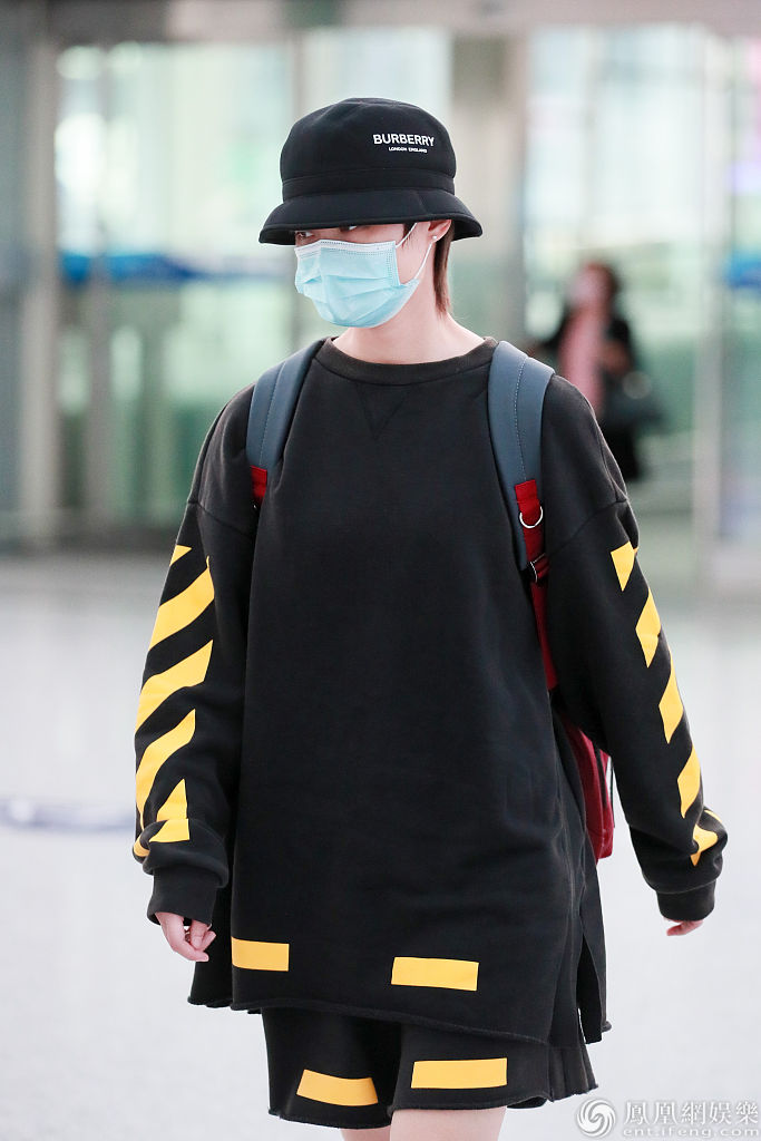 ”——2020年5月1日至4日,北京,李宇春出现在机场。她穿着条纹工作服和短裤出现在机场,戴着渔夫帽,穿着长筒袜以显示时尚