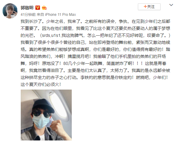 郭敬明说,以前所有的误解和纠纷在看到这些青少年后都不重要了。“在他们的眼里,我看到了比今年夏天更热的梦的光。我看到许多许多从前的自己站在即将到来的舞台前,紧张而激动地等待着。我真的希望我的兄弟们能实现他们的梦想。你是最好的,你应该得到最好的!兄弟们踩着风浪,冲啊!摘星摘月!”