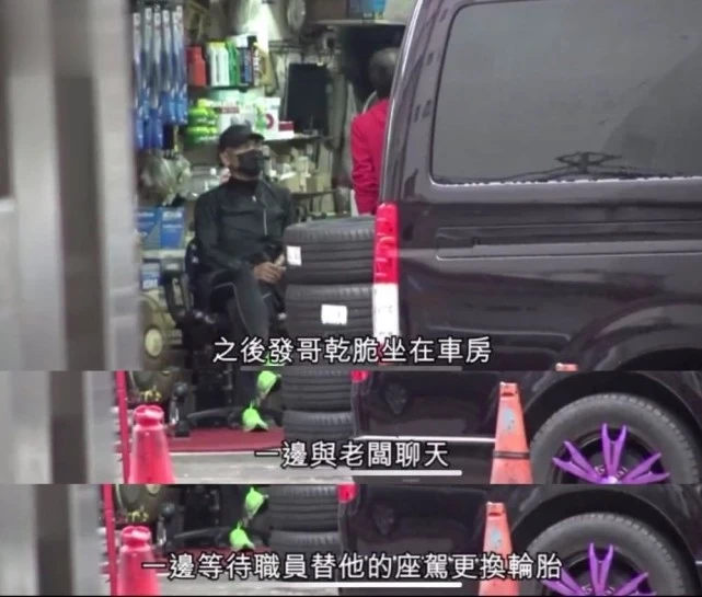 原来,发哥座驾正在该店换轮胎。在粉丝离开后,发哥干脆坐在店里,一边与店主和工作人员聊天,一边安心等待。