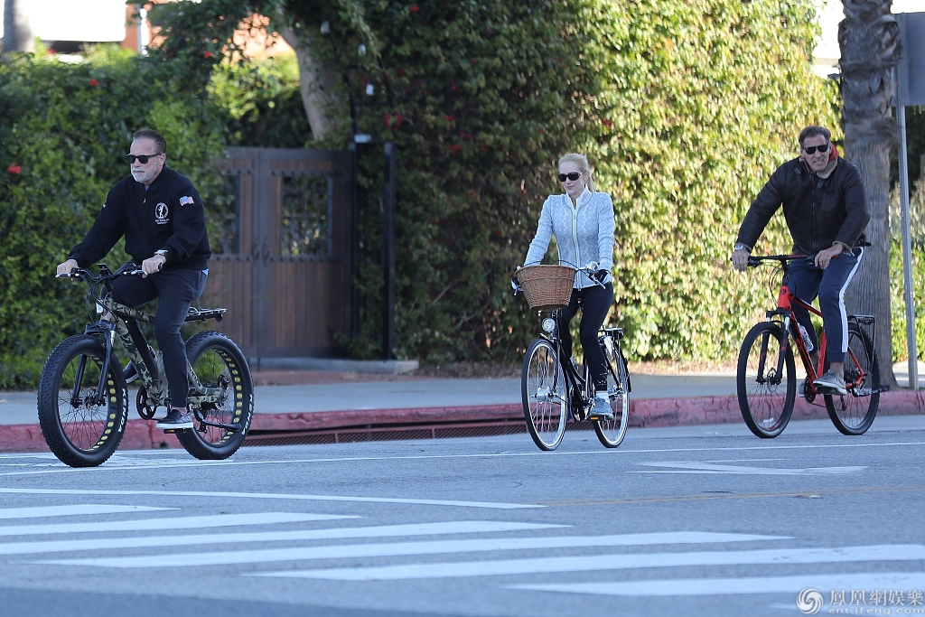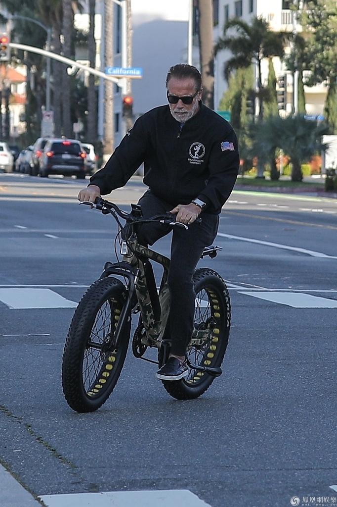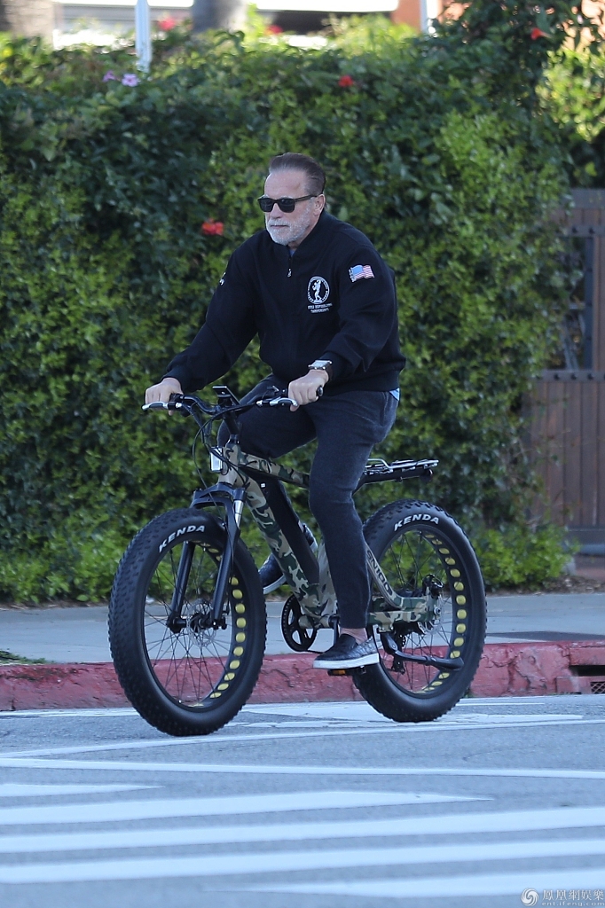 施瓦辛格边骑车边向路边的粉丝挥手示意。