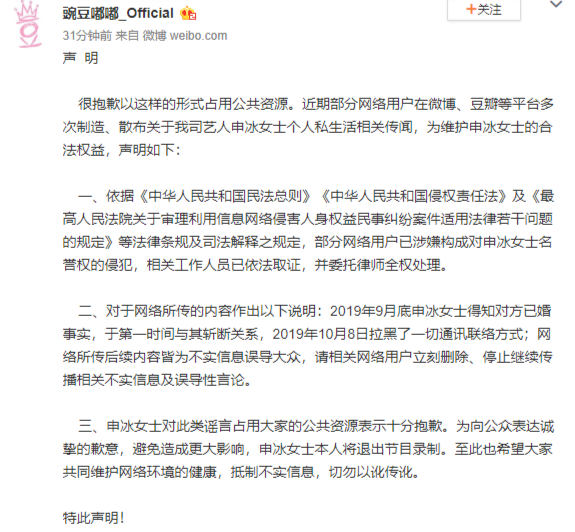 申冰方发声明表示,2019年9月底申冰得知对方已婚事实,于第一时间与其斩断关系,2019年10月8日拉黑了一切通讯联络方式;网络所传后续内容皆为不实信息误导大众。为向公众表达诚挚的歉意,避免造成更大影响,申冰将退出《青春有你2》节目录制。