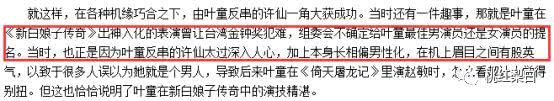 据说当年《新白娘子传奇》参评奖项时,还闹出过到底该给叶童颁发“最佳男主角”还是“最佳女主角”的乌龙。
