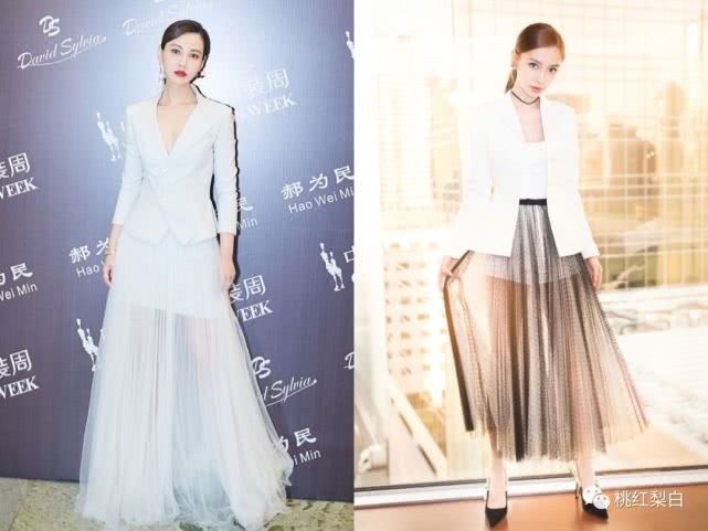 白色西装搭配纱裙的造型,也颇有姐妹花的神韵。