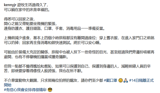 他还说“全副武装”引来旁人奇怪目光,似乎受到歧视:“可能由于装备太充足的关系,旅程中也被人投下一些奇怪的目光,甚至经过我们旁边扮咳嗽再避开,也有不停举机拍摄当成猎奇摄影。但我一点都不觉得尴尬和羞耻,如果可以保护到自己,保护到身边的人,减轻前线人员的辛苦,即使要穿着得像怪人般夸张,我也在所不辞。不介意当动物大观园,只求那几位拍照的朋友,请你们至少都戴口罩。14日隔离正式开始,有信心我会安排得很精彩。”