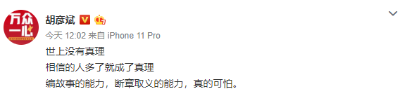 3月25日,胡彦斌发文谈网络负能量对自己的影响,他称:“世上没有真理,相信的人多了就成了真理。编故事的能力,断章取义的能力,真的可怕。”