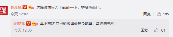 随后他还在该动态的评论区中写道:“这篇博文只为了mark一下,护身符而已。”“真不喜欢自己的社交账号传播负能量,乌烟瘴气的”。