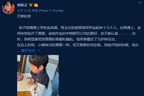 3月25日,章龄之在社交网上晒出儿子酒酒练字的照片,并发长文谈教育,她总结道:“有时候真的是巴掌和枣必须兼给。不能总给枣,该打‘巴掌’(批评教育)的时候不能手软。”