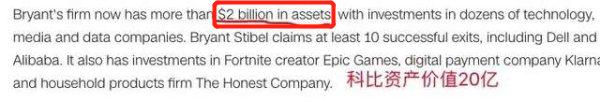 据官方统计,科比这20年来职业生涯的总薪水加上生前购买的豪宅超车,以及名下投资入股的10余家技术公司和数据公司收益,总价值高达20亿美金(约等于人民币140亿元)。