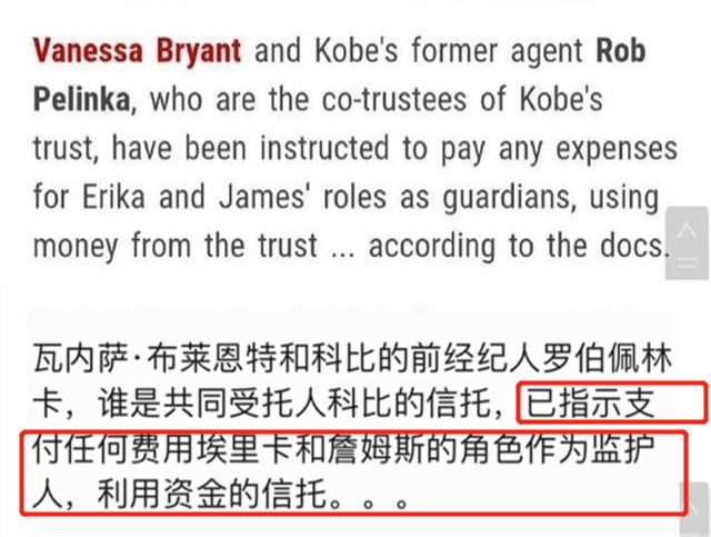 据悉,瓦妮莎和科比生前的经纪人罗伯-佩林卡作为科比信托基金的负责人,他们将支付埃里卡和詹姆斯作为监护人的任何费用,这笔钱会从科比信托基金中扣取。