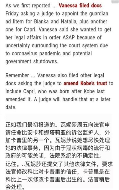 据悉,科比去世前,还没来得及修改信托基金的条例,将当时才7个月大的小女儿卡普里的名字添加进去,日前瓦妮莎为小女儿向法院提交了修改科比信托基金名单的申请,但由于疫情,该申请暂时还未受理。