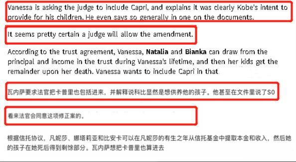 而科比在2013年时,就为瓦妮莎和孩子们建立了一个信托基金,每当一个孩子出生,该信托基金的条款都会修改,将其名字加入进来。根据信托协议,科比的遗孀瓦妮莎和三个孩子有生之年可以从信托基金中提取本金和收入,瓦妮莎去世后,孩子们可以得到剩余的部分。