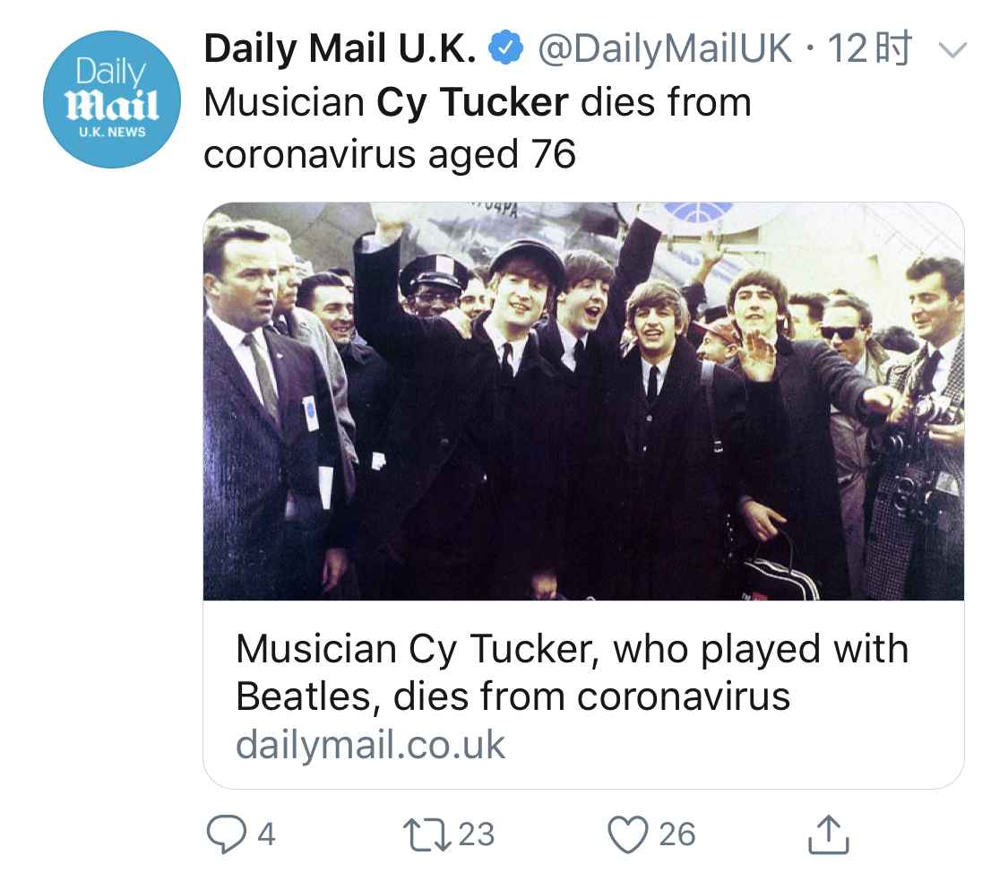 Cy Tucker是利物浦著名音乐人之一,早年他曾与著名乐队甲壳虫一起演出过。得知Cy Tucker去世的消息后,歌手Ian Prowse发文表示:“很遗憾听到这个消息,利物浦所有人都听过你的传奇故事。”