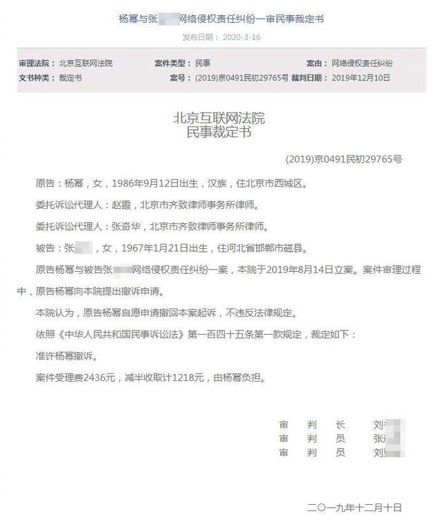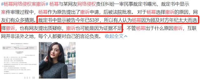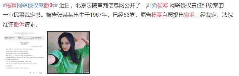 3月25日,媒体公布了北京法院审判信息网公开了一则杨幂与某网友网络侵权责任纠纷案的一审民事裁定书,被告张某某出生于1967年,已经是53岁的年龄,杨幂作为原告提出撤诉引发了网友热