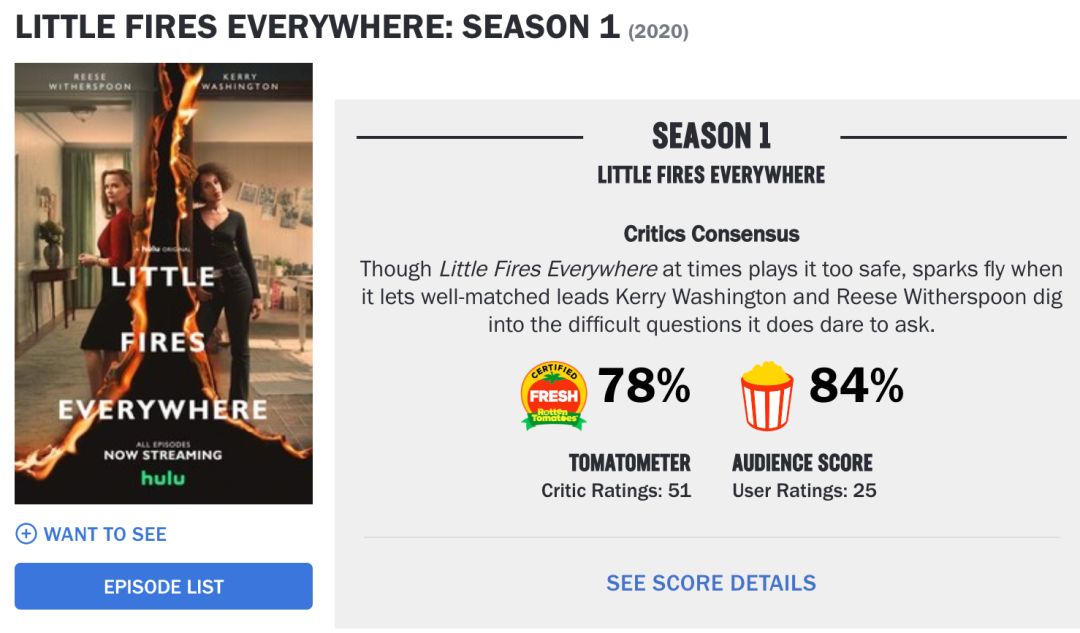 上周开播至今,《星星之火》的豆瓣已看人数还不到一千人。剧集的烂番茄新鲜度有78%,不算好也不算太坏——毕竟是根据畅销小说改编的,观众基础和剧情都有保障。