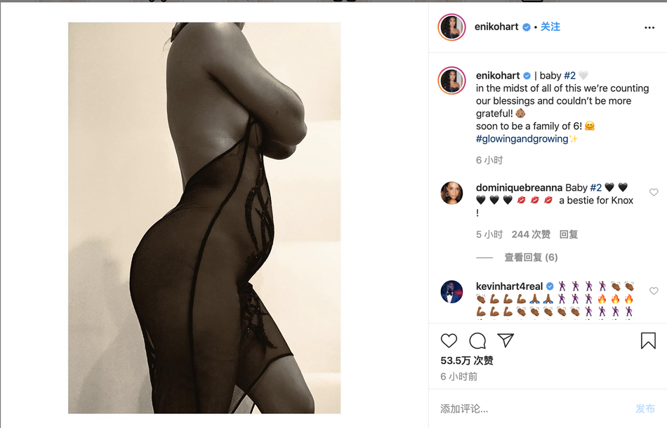 3月25日,出演过《勇敢者游戏》的好莱坞男星凯文·哈特(Kevin Hart)的妻子艾妮科·帕瑞斯(Eniko Parrish)在个人社交平台晒出了孕肚照片,并配文“在这一切之中,我们非常感恩!马上就是六口之家了!