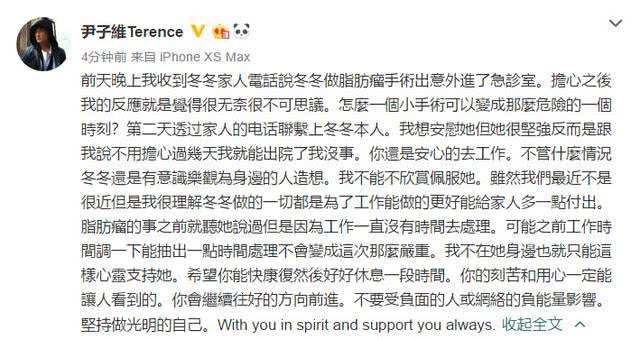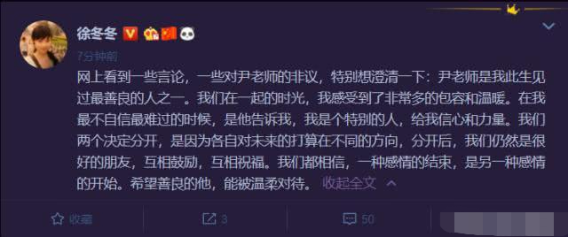 辟谣分手后仅过去几个月,两人就真的分手了。尹子维和徐冬冬先后发文表示分手后还是好朋友,一时间引起网友热议。网友则将分手原因归咎于尹子维,网上出现了很多尹子维的负面爆料,当时徐冬冬还发文维护尹子维。徐冬冬因为做脂肪瘤手术中突发意外被紧急送医后,尹子维同样发文表示关心,还亲自联系了徐冬冬,安慰鼓励她。虽然分手了,两人依旧保持着非常亲近的朋友关系。