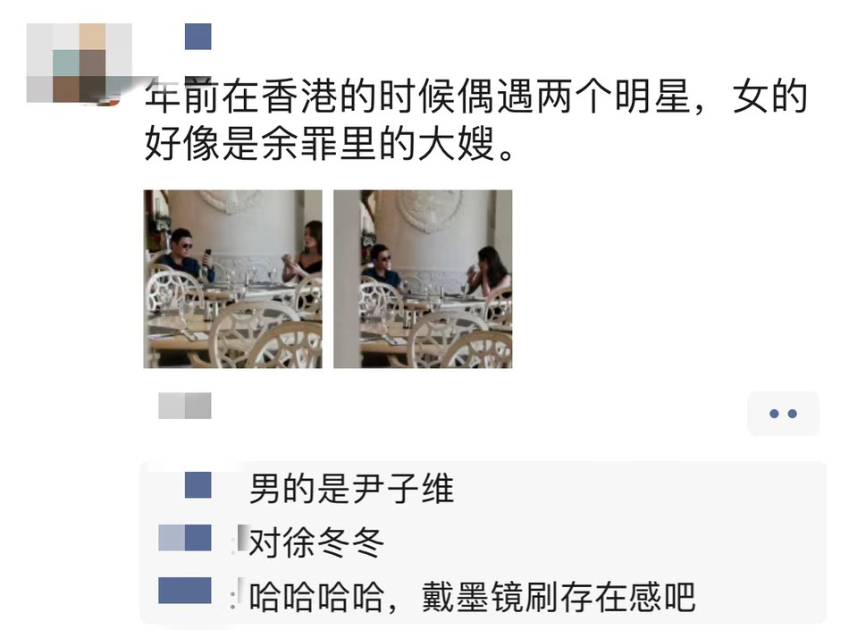 2月15日,有网友发朋友圈爆料称年前偶遇“大嫂”徐冬冬和尹子维在香港甜蜜约会,还晒出当时偶遇的照片。照片中的尹子维戴着黑色墨镜,徐冬冬身穿黑色吊带裙,两人单独约会,现场并没有其他