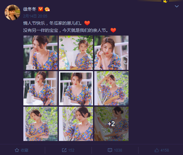 照片中的徐冬冬依旧是性感出镜,身穿印花连衣裙的化身油画女郎,带来来扑面的春意盎然。同时她还配文称:“情人节快乐,冬瓜家的崽儿们。没有另一伴的宝宝,今天就是我们的亲人节。”,徐冬冬称情人节是她和没有另一伴粉丝的亲人节,透露了自己仍是单身,所以她并没有和尹子维复合?