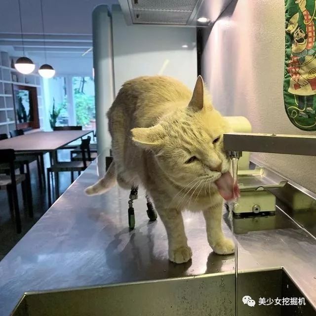 口渴了,一个飞跃跳到厨柜上,开心的舔着水龙头流出来的水。