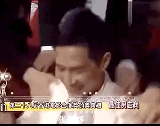 拿第28届金像奖最佳男主角名单揭晓时,得知自己获奖的张家辉给了关咏荷一个大大的拥抱。