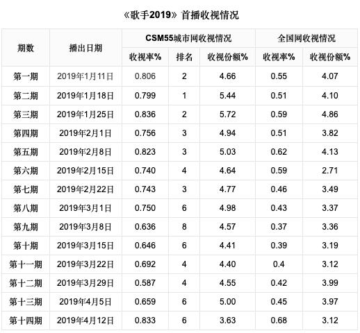 除了音乐产业环境的变迁,《歌手》变革的导火索应该是上一季节目在收视率上的惨败。《歌手2019》网罗了刘欢、吴青峰、杨坤、齐豫、克里斯蒂安·科斯托夫等实力唱将,阵容堪称是“神仙打架”,但从头至尾收视率都没有破1。